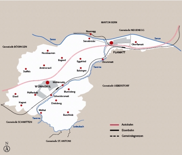 Die Gemeinde Wünnewil-Flamatt finden wir auf halbem Weg zwischen Bern und Freiburg. So durchqueren sowohl die Ost-/Westtangente der SBB sowie die Autobahn A12 das Gemeindegebiet.